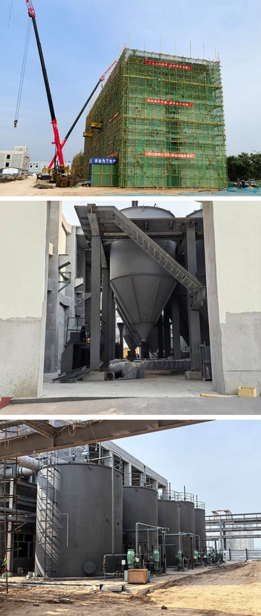 一、 硫化黑裝置總體安裝情況: 1、設(shè)備安裝情況 主體設(shè)備已安裝完成。 2、管道安裝情況 工藝管道:硫化前部、硫化、水解、尾氣已安裝完成90%。 儀表管道:硫化前部、硫化完成80%、水解安裝完成95%。 3、電氣、儀表安裝情況 硫化黑裝置配電室安裝完成80%,水解動(dòng)力、儀表電纜敷設(shè)完成,接線完成90%,硫化動(dòng)力、儀表電纜敷設(shè)完成,接線完成95%,硫化前部?jī)x表、動(dòng)力電纜正在敷設(shè)完成90%,接線完成30%。 二、噴霧干燥裝置 1、設(shè)備安裝情況 設(shè)備安裝完成,設(shè)備保溫已施工完成。 2、管道安裝情況 管道安裝完成95%,管道保溫已施工完成。 3、電氣、儀表安裝情況 電氣、儀表已全部安裝完成。 三、尾氣處理裝置 施工情況: 1、 設(shè)備安裝:裝置內(nèi)主要設(shè)備已安裝完成80%; 2、 工藝管道安裝:工藝管道預(yù)制焊接安裝完成60%; 3、 儀表管道:現(xiàn)場(chǎng)正在預(yù)制; 4、 電氣安裝:現(xiàn)場(chǎng)正在整理設(shè)備就地操作柜準(zhǔn)備開(kāi)始安裝; 5、 儀表安裝:未開(kāi)始安裝; 四、非標(biāo)儲(chǔ)罐 1、現(xiàn)場(chǎng)非標(biāo)儲(chǔ)罐共計(jì)24臺(tái),現(xiàn)場(chǎng)已制作焊接完成。 2、非標(biāo)儲(chǔ)罐防腐噴漆完成80%。 五、滾筒干燥混合機(jī)安裝 1、設(shè)備:主要設(shè)備已安裝就位完成。 2、 電氣:低壓配電柜已安裝就位完成,電纜橋架安裝完成,電纜鋪設(shè)完成,接線完成70%。